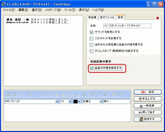 会話の内容を保存するには、[設定]タブの[会話の内容を保存する]を選択してください。この操作は、インスタントメッセージまたはチャットルームを作成したときに実行するか、インスタントメッセージの会話の途中で有効にすることができます。