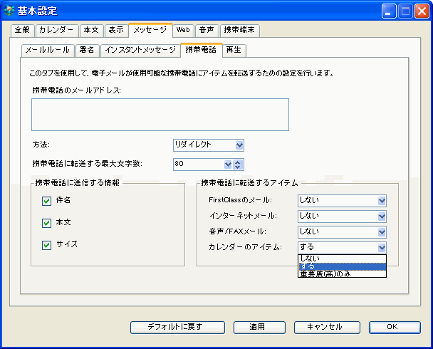 リマインダを携帯電話に転送するには、[基本設定]の[メッセージ]の[携帯電話]を編集してください。[カレンダーのアイテム]で[する]または[重要度(高)のみ]を選択してください。