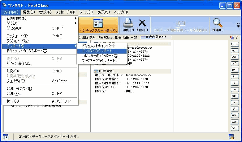 共有コンタクトデータベースにインポートする場合は、あらかじめそのコンタクトデータベースを開いてください。開かなかった場合は、[コンタクト]フォルダ内にコンタクトが作成されます。