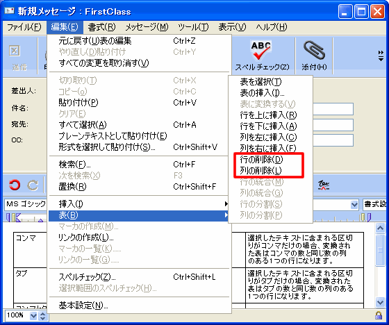 セル自体は削除せずにセルの本文だけを削除するには、行または列(または、表自体ではなく表全体の本文を)選択して、[Delete]キーを押してください。