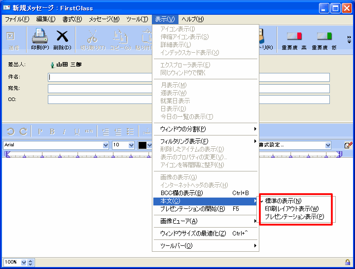 デフォルトでは、FirstClassはユーザが作成した本文および書式設定されていない本文(インターネットメッセージ内のプレーンテキストなど)を、[基本設定]の[本文]タブにある[表示方法]で指定されている