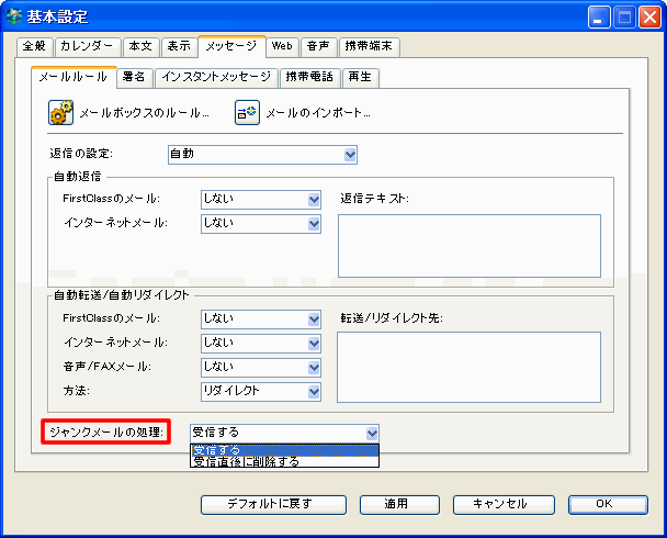 FirstClassがジャンクと判断したメールの処理方法を指定するには、[基本設定]の[メールルール]の[ジャンクメールの処理]で、目的のオプションを選択してください。