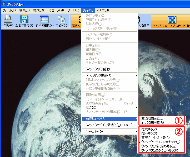 [表示]>[画像ビューア]>[左に90度回転]または[右に90度回転]を選択します。