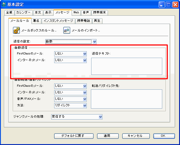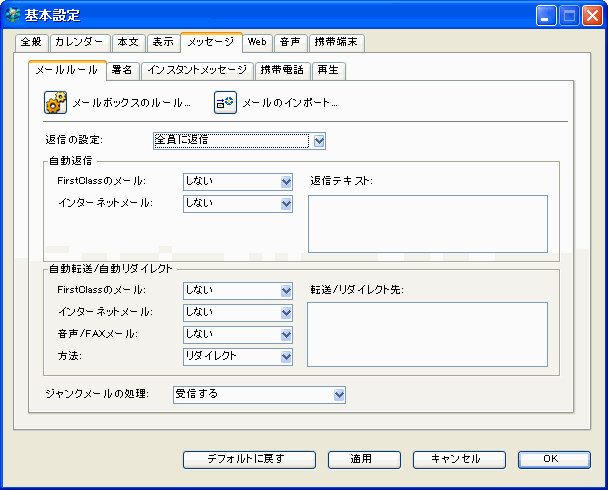 個人の返信メッセージのデフォルト受信者を指定するには、[基本設定]の[メッセージ]の[メールルール]にある[返信の設定]で、デフォルトの受信者を選択してください。