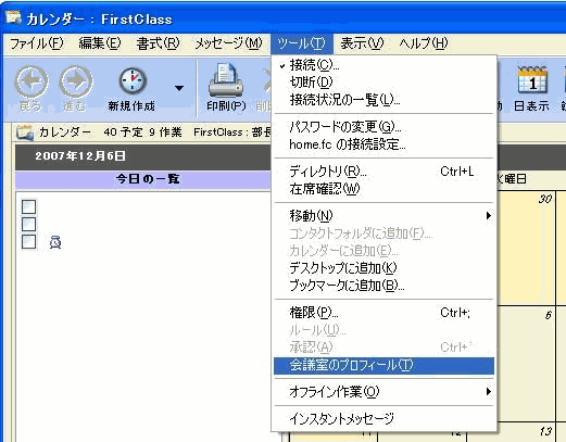 カレンダーの情報を表示するには、カレンダーを選択し、[ツール]>[会議室のプロフィール]を選択してください