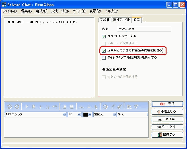 会話内容を最初から表示させるには、[途中からの参加者に会話の内容を見せる]を選択してください。選択した時点からの会話内容が、招待した参加者全員に表示されるようになります。