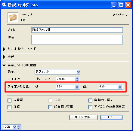アイコンの位置を個別に固定するには、そのアイコンの[プロパティ]フォームで[アイコンの位置を固定する]を選択します。