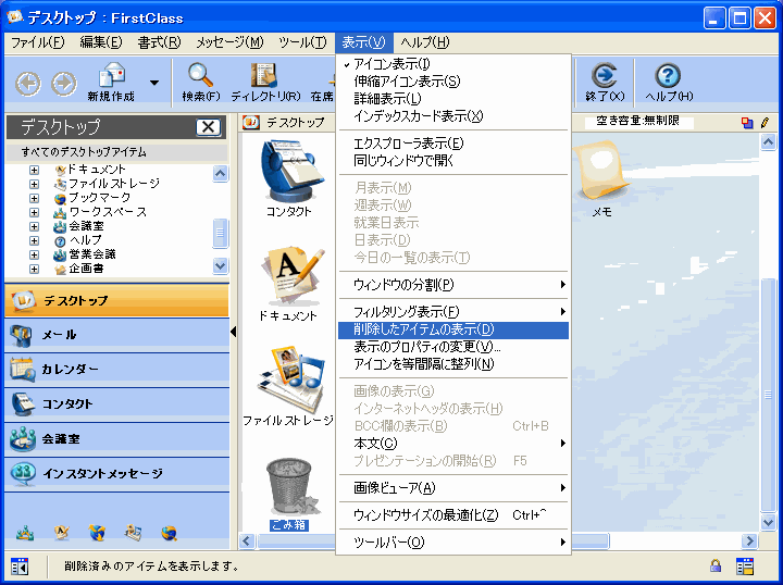 1       [表示]>[削除したアイテムの表示]を選択します。