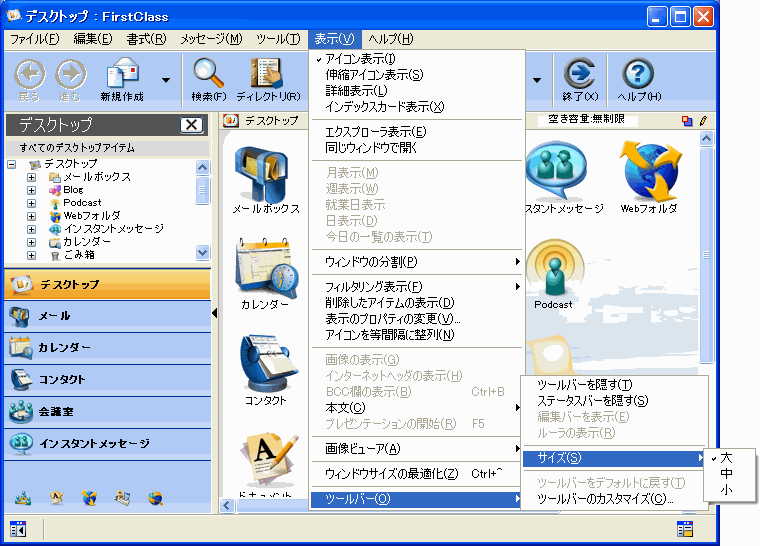 ツールバー上にあるすべてのボタンは、[大][中][小]の3種類のサイズで表示できます。ボタンのサイズを変更するには、[表示]>[ツールバー]>[サイズ]を選択し、希望する大きさを選択してください。