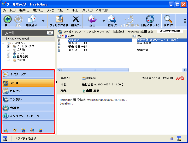 ナビゲーションペインの下にあるナビゲーションバーのアプリケーションボタンをクリックすると、メールやカレンダーなどFirstClassのアプリケーションが起動します。アプリケーションボタンをクリックすると、そのアプリケーションに対応するコンテナが開かれます。