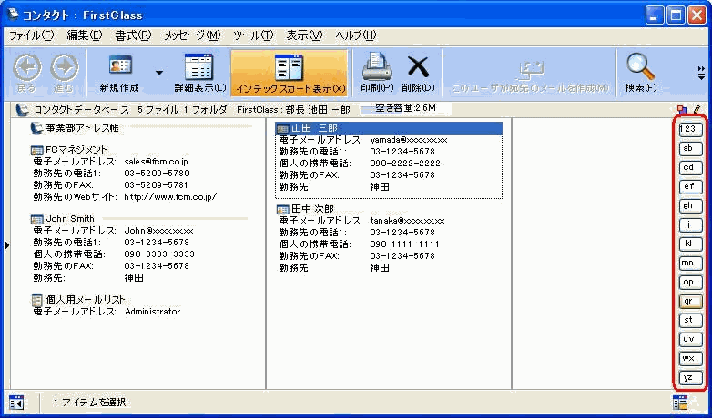 特定の文字で始まるコンタクトの先頭のコンタクトを表示するには、コンタクトデータベースのウィンドウの右側にある適切なボタンをクリックしてください。