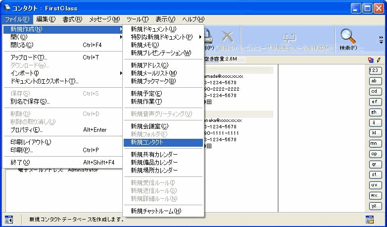 1       [ファイル]>[新規作成]>[新規コンタクト]を選択します。
