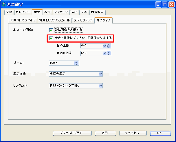 [基本設定]フォームを開き、[本文]タブの[オプション]タブで[大きい画像はプレビュー用画像を作成する]を選択してください。必要に応じて、FirstClassが貼り付け画像を自動的にプレビュー化してサイズを変更する際に適用される、画像の幅と高さの上限を設定してください。