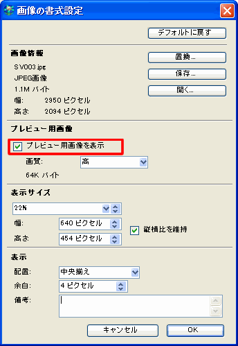 1 [画像の書式設定]フォームで[プレビュー用画像を表示]を選択します。