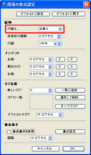 • [書式]>[段落の書式設定]を選択し、[配列]の[行揃え]で希望する行揃えを選択する