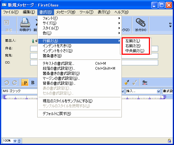 • [書式]>[行揃え]を選択して、適用する行揃えを選択する