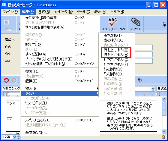[編集]>[表]>[行を上に挿入]を選択します。 |