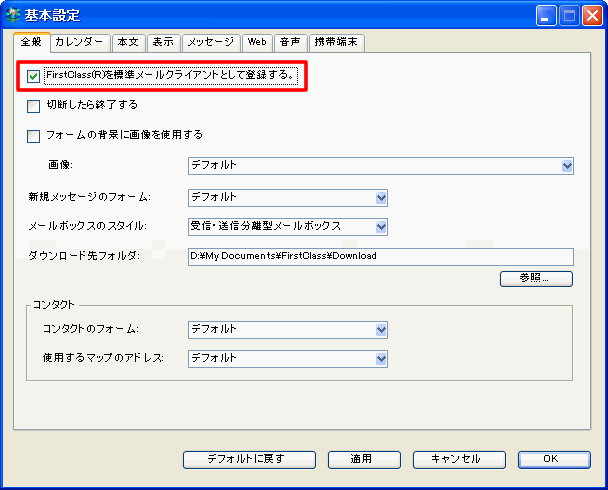 FirstClassを標準メールクライアントに設定するには、[基本設定]の[全般]タブで[FirstClass(R)を標準メールクライアントとして登録する]を選択してください。