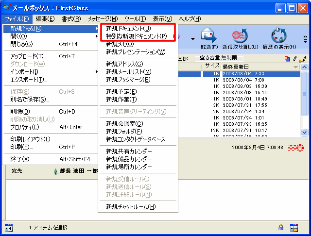 FirstClassの標準メッセージフォームを使用してインターネット経由でメッセージを送信する場合、[差出人]欄に表示されるアドレスを選択できます。インターネット経由でこのメールを受信した相手にはFirstClassのユーザ名は表示されず、インターネットメールのアドレスだけが表示されます。
