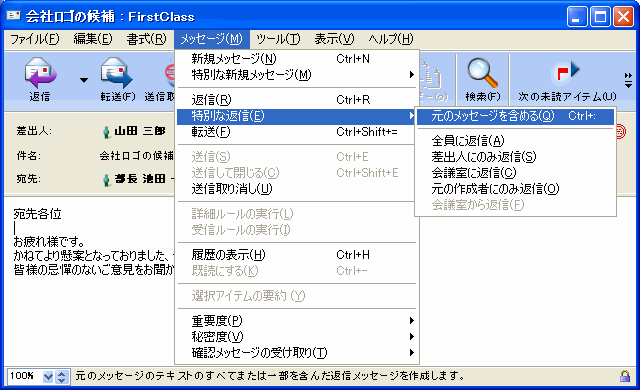 2 [メッセージ]>[特別な返信]>[元のメッセージを含める]を選択します。