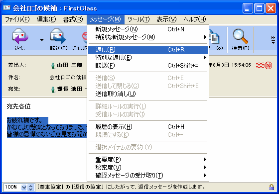 返信メッセージに、元のメッセージの全部または一部を引用することができます。引用部分の先頭には元のメッセージの差出人名が表示されます。また、基本設定によっては、元のメッセージの送信日時が表示されます。