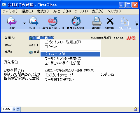 メッセージの差出人がFirstClassに登録されている場合は、その差出人に関する情報を表示できます。表示するには、宛先領域の差出人を選択し、コンテキストメニューから[プロフィール]を選択してください。同じ方法で、このメッセージの他の受信者に関する情報を表示したり、メールリストに属しているユーザを確認したりできます。