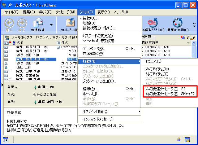 スレッドに含まれるメッセージを表示または選択している場合は、[ツール]>[移動]>[次の関連メッセージ]を選択すると、スレッド内の次のメッセージを開くことができます。