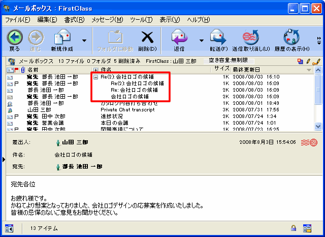 あるメッセージへの返信メッセージとして送信された、同じ件名を持つ複数のメッセージは、特別な方法で表示されます。メッセージへの返信が増えると、メッセージスレッドが作成されます。スレッド内の各返信メッセージには番号が付けられます。デフォルトでは、最初の返信の件名は「Re:」で始まり、この返信メッセージへの返信の件名は「Re(2):」となり、以降は同じように続きます。