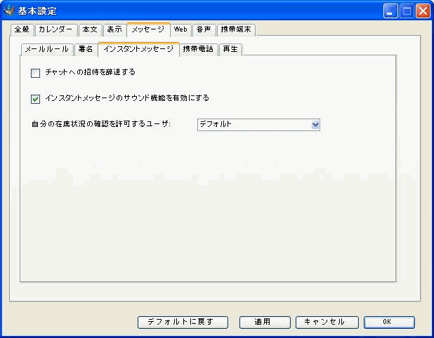 [インスタントメッセージ]フォームの[設定]タブにある[サウンドを有効にする]の設定は、各インスタントメッセージの基本設定より優先して適用されます。