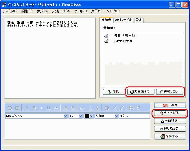 2102006_35208_0.png主催者のいる個人用インスタントメッセージでは、インスタントメッセージの作成者だけが他のユーザの発言を許可できます。主催者のいる公開チャットルームでは、主催者だけが他のユーザの発言を許可できます。