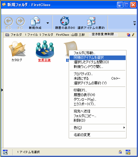 さらに、同じ作成者や同じ日付など、共通する内容のオブジェクトだけを選択することもできます。この機能は、あるオブジェクトを一覧から目で追って探す際に、候補となるオブジェクトだけを強調表示するのに役立ちます。選択するには、コンテキストメニューから[同様のアイテムを選択]を選択します。