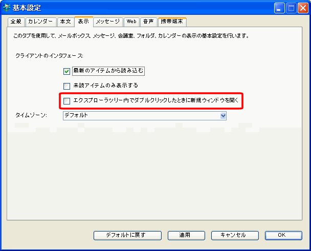 •     基本設定で[エクスプローラツリー内のダブルクリックで新規ウィンドウを開く]の選択を解除する。