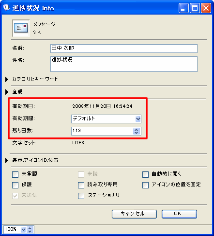 [プロパティ]フォームで有効期限を変更してから会議室にメッセージを送信した場合、メッセージの有効期限はその会議室のデフォルトの有効期限ではなく、送信前に指定した有効期限になります。
