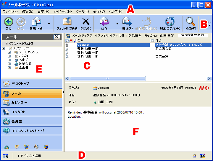 C       メッセージなど開いたコンテナやオブジェクトの内容を表示するメインペイン
