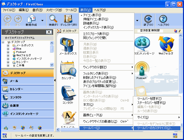 1 [表示]>[ツールバー]>[ツールバーのカスタマイズ]を選択します。