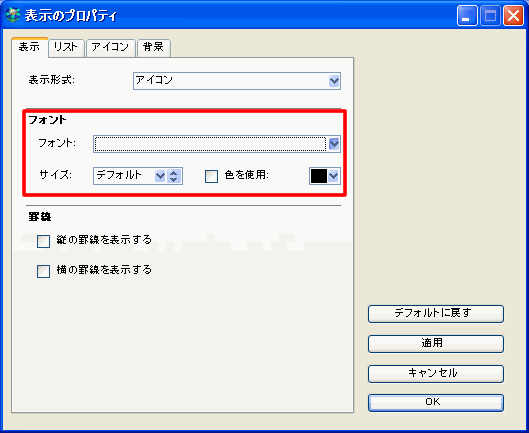 ペインのテキストの表示を変更するには、[表示のプロパティ]フォームの[表示]タブで、[フォント][サイズ][色を使用]の各フィールドを更新してください。