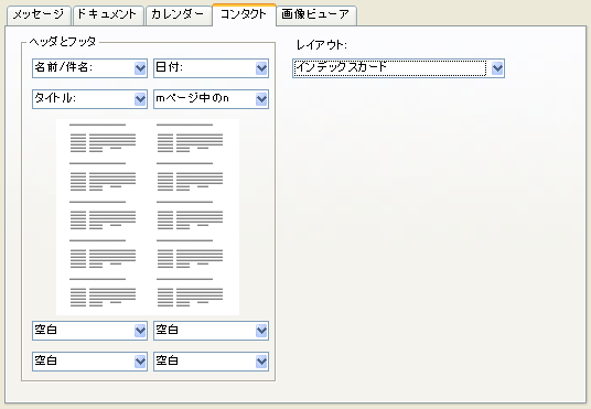 これらのタブを使用して、[コンタクト]フォルダとコンタクトデータベースを印刷する方法を設定します。