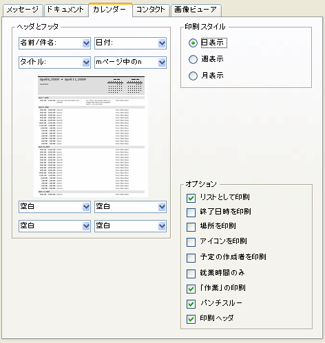 このタブを使用して、印刷するカレンダーの内容と表示方法を設定します。