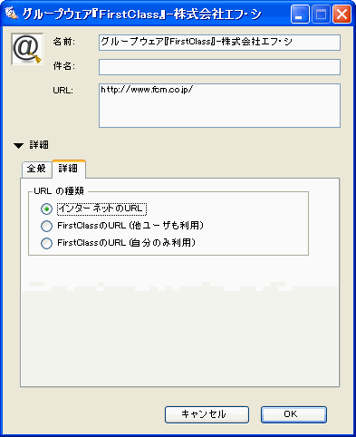 このブックマークに登録されたリンク先オブジェクトのURLです。 このURLを変更するには、新しいURLを入力するか、またはオブジェクト(FirstClassの会議室アイコンやブラウザのU