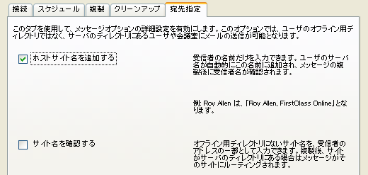 複製後、サーバのディレクトリに登録されているサイトにメッセージをルーティングします。 これにより、オフラインのディレクトリにないサイト名を受信者のアドレスに使用できるようになります。 |