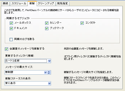 このタブを使用して、FirstClassパーソナルとサーバとの複製に関するオプションを設定します。