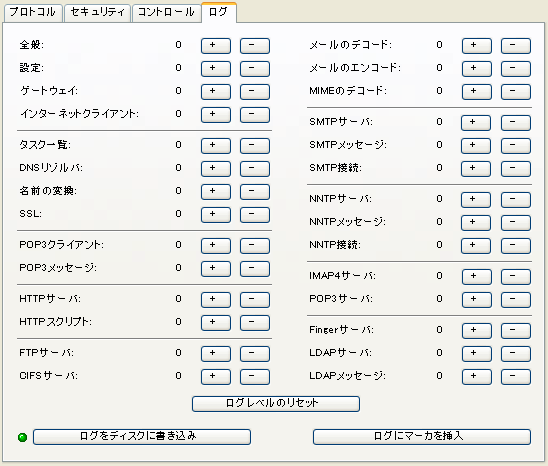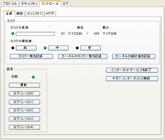 [更新]ボタンを押すと、インターネットサービスが設定フォーム(InetSvcs.cf)を再読み込みします。 注意FirstClassは、数分おきに設定フォームを自動的に再読み込みします。このボタンは、今すぐ再読み込みをしたい場合にクリックしてください。このボタンは、以前の[設定の再読み込み]ボタンに代わるものです 設定の再読み込み中は、インターネットモニタのステータスランプが黄色になります。 [ログを