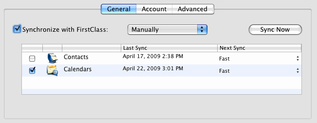 All items are removed from the Mac application (iCal, Address Book), and replaced with the corresponding items from FirstClass. In other words, FirstClass items replace Mac items. CautionApplications that synchronize with your Mac (for example, MobileMe) will be cleared of items and those items replaced with FirstClass items. Fields in those applications that synchronize to the Mac but aren't supported by FirstClassSync will be lost. |
