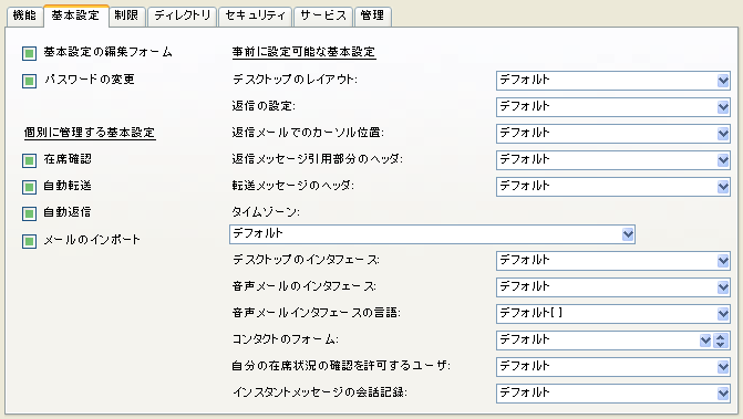 ユーザが[基本設定]フォームで自動転送、自動リダイレクト、および携帯電話への転送を設定できるようにします。 |