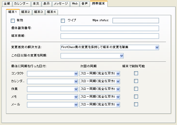FirstClassに同期されている携帯端末上のデータを削除できるようにする場合に、このチェックボックスを選択します。 注意デバイスによっては、携帯端末上のデータベースを削除するときに、「すべて削除」するよう指示するコマンドを送信する場合があります。したがって、(コンタクトやカレンダーなどの)データベースを携帯端末から誤って削除すると、FirstClassの対応するデータベースがすべて削除されてしまう場合があります。 |