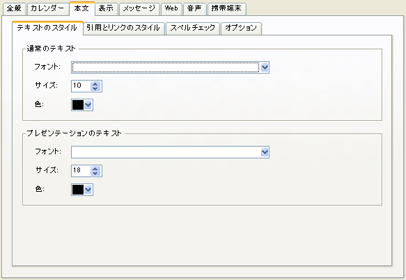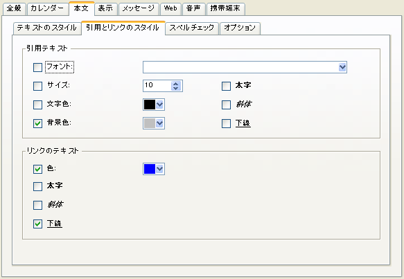 返信メッセージなどに含まれる引用テキストのスタイルです。引用テキストは、差出人の設定したスタイルにかかわらず、常にこのスタイルで表示されるようになります。 該当する各フィールドで設定した内容が反映されるようにするには、[使用するフォント]、[使用するサイズ]、[使用する色]、および[使用する背景色]の各チェックボックスにチェック