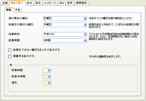 週の先頭に表示する曜日で、月表示のカレンダーと[今日の一覧]内の小さい月間カレンダーのペインに適用されます。 |