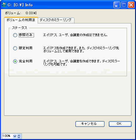 これを有効にすると、このボリューム上でユーザ、会議室、エイリアスを新しく作成できるようになります。[完全利用]のボリュームでは、ディスク全体のミラーリングを行うことができます。監査は、[完全利用]のボリュームに対してだけ実行されます。