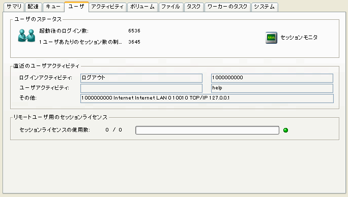 使用中のネットワークセッションとモデムセッションの合計数、およびすべてのネットワークセッションとモデムセッションの合計数です。正常な範囲で使用されている場合はランプが緑色に、利用可能セッション数の90パーセントに達した場合は黄色に、100パーセントに達した場合は赤色に点灯します。このランプは、[LEDのリセット]をクリックするまで、使用中のセッション数が最も多いときの状態のままになります。 このランプが頻繁に黄色または赤色になる場合には、システム上で許可する同時セッション数(レギュラーユーザライセンス数)を増やすことを検討してください。 |