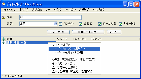 他のユーザのカレンダーを開くには、ディレクトリ、[在席確認]リスト、メッセージの宛先領域、または[インスタントメッセージ]フォームでコンテキストメニューを開いて、[ユーザのカレンダーを開く]をクリックしてください。